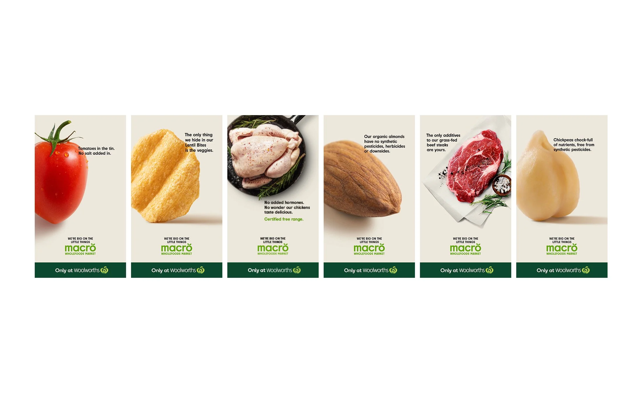 Design and rollout of static digital assets for the integrated campaign “We’re big on the little things.” Collaborating with the art director, motion designer, and finished artist to ensure cohesion across all touchpoints. Macro is a sub-brand of Woolworths, known for its focus on natural, organic, and ethically produced foods.